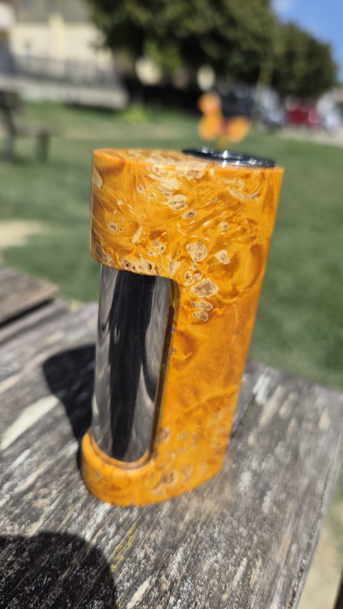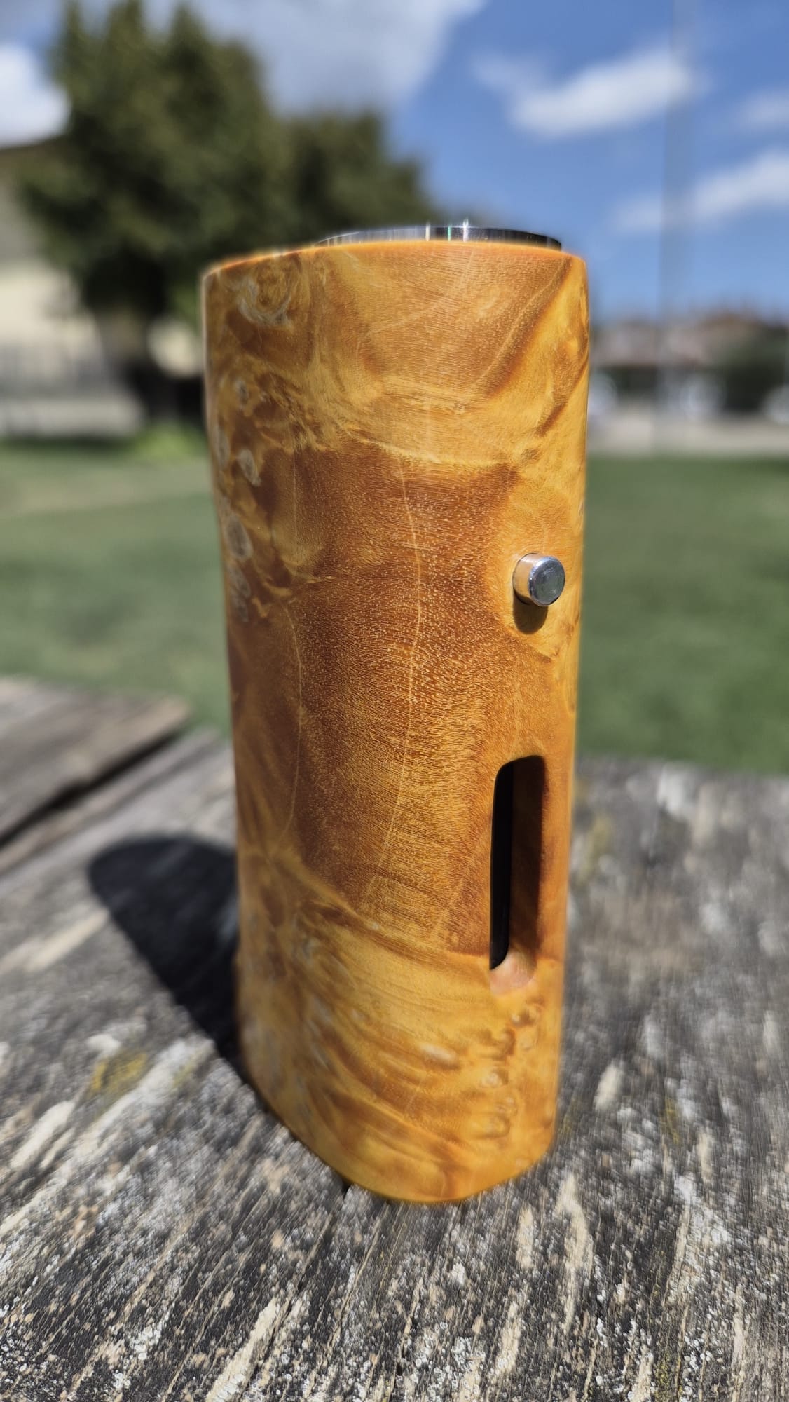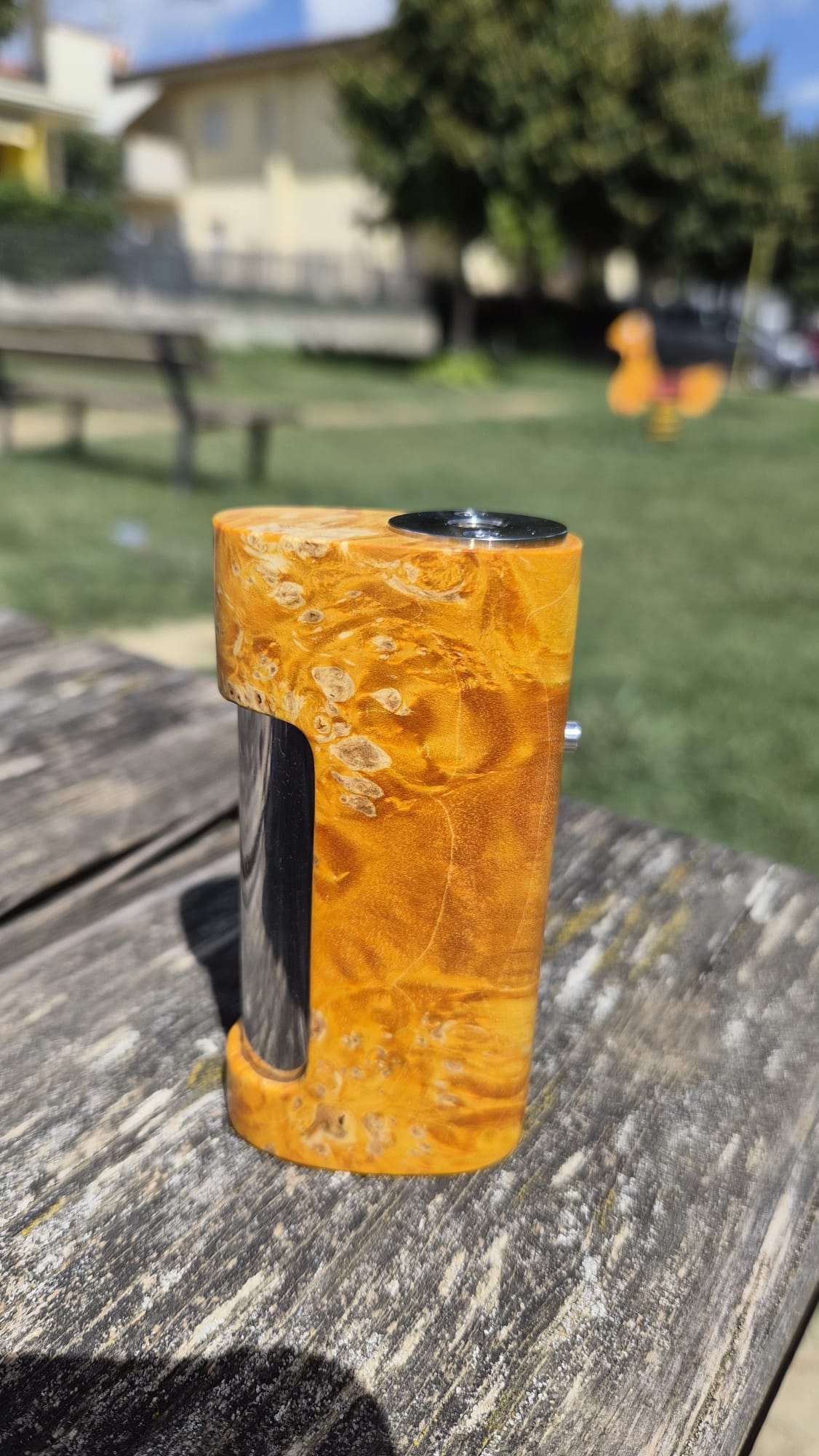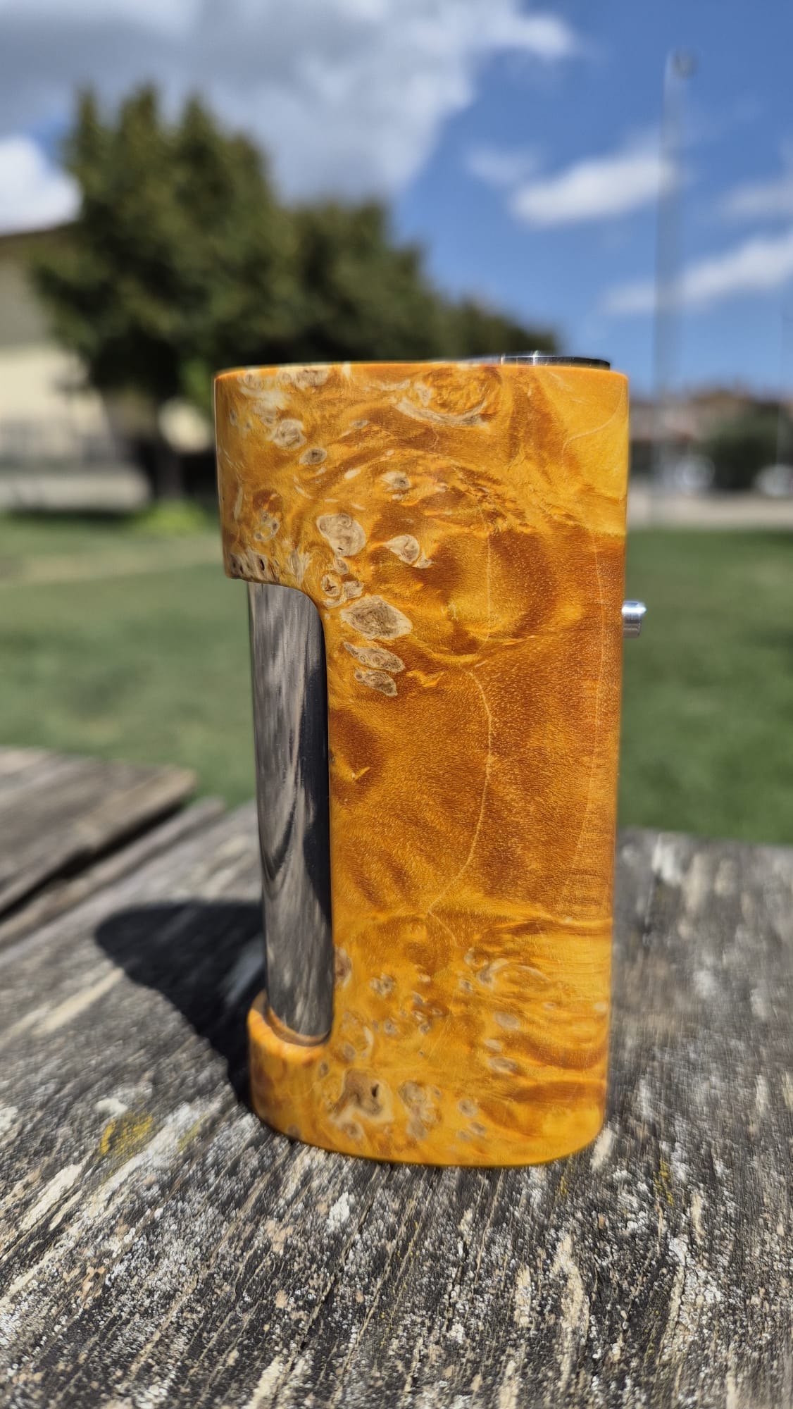 Box Mod con corpo in Legno di Radica di Acero Stabilizzato, lavorato a mano. Ogni pezzo ha venature e tonalità uniche. Elettronica; Nucleo Compact 60W.