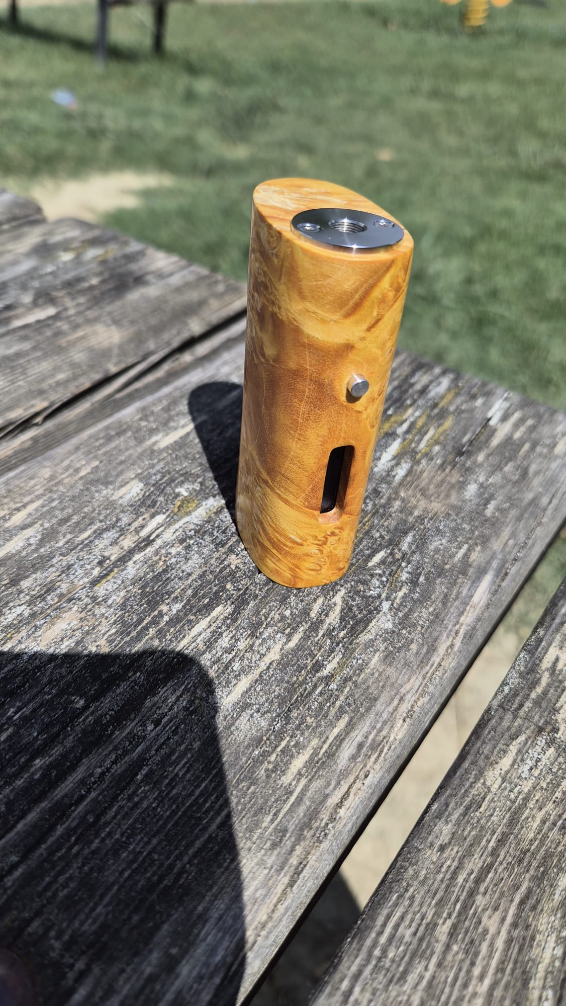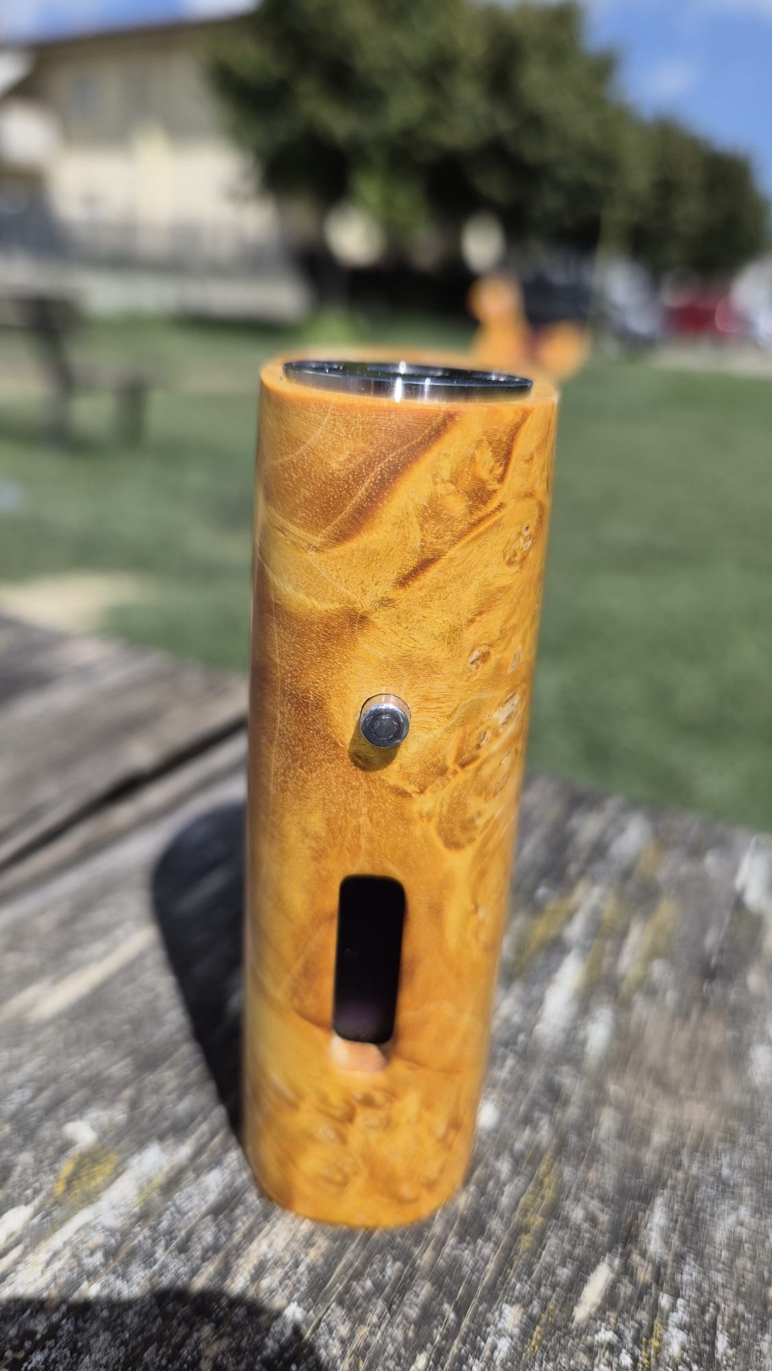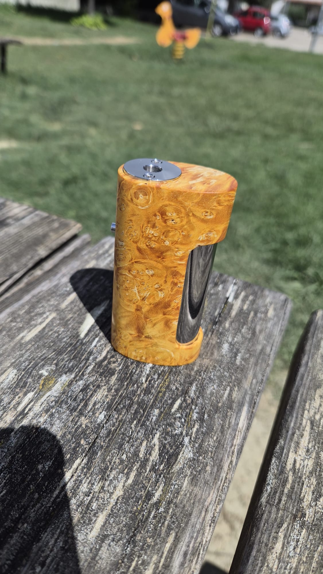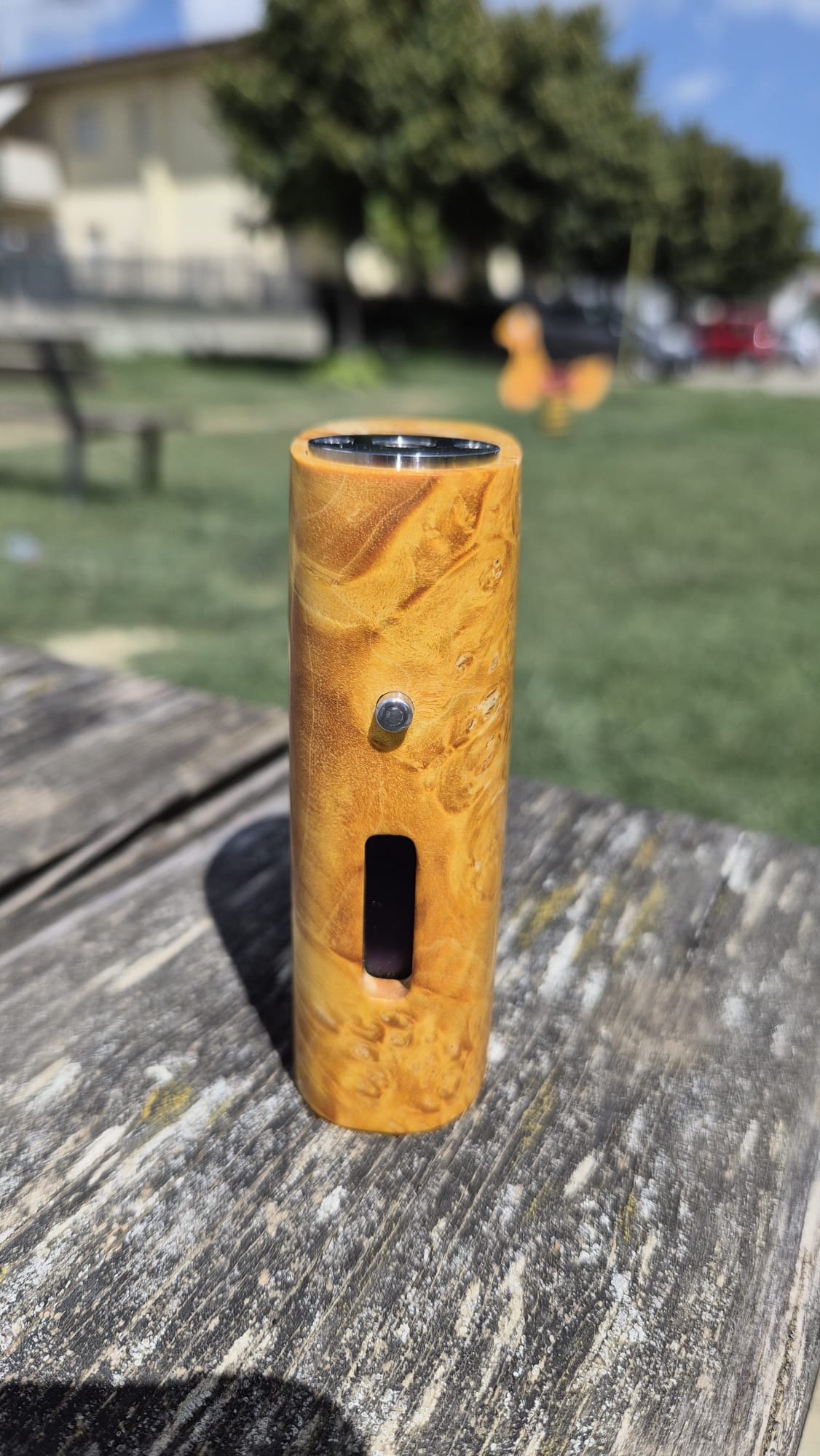 Box Mod con corpo in Legno di Radica di Acero Stabilizzato, lavorato a mano. Ogni pezzo ha venature e tonalità uniche. Elettronica; Nucleo Compact 60W.