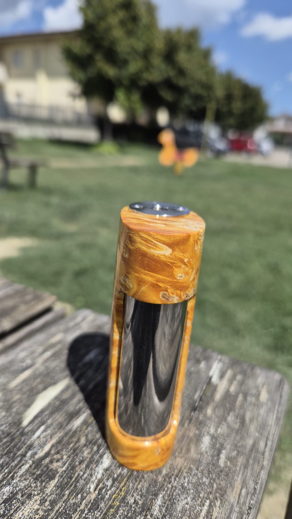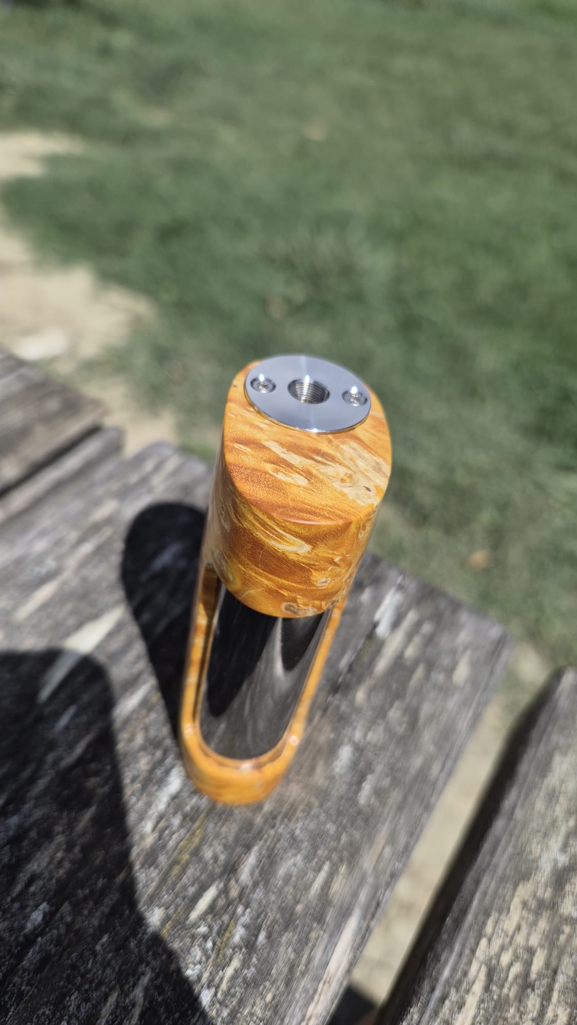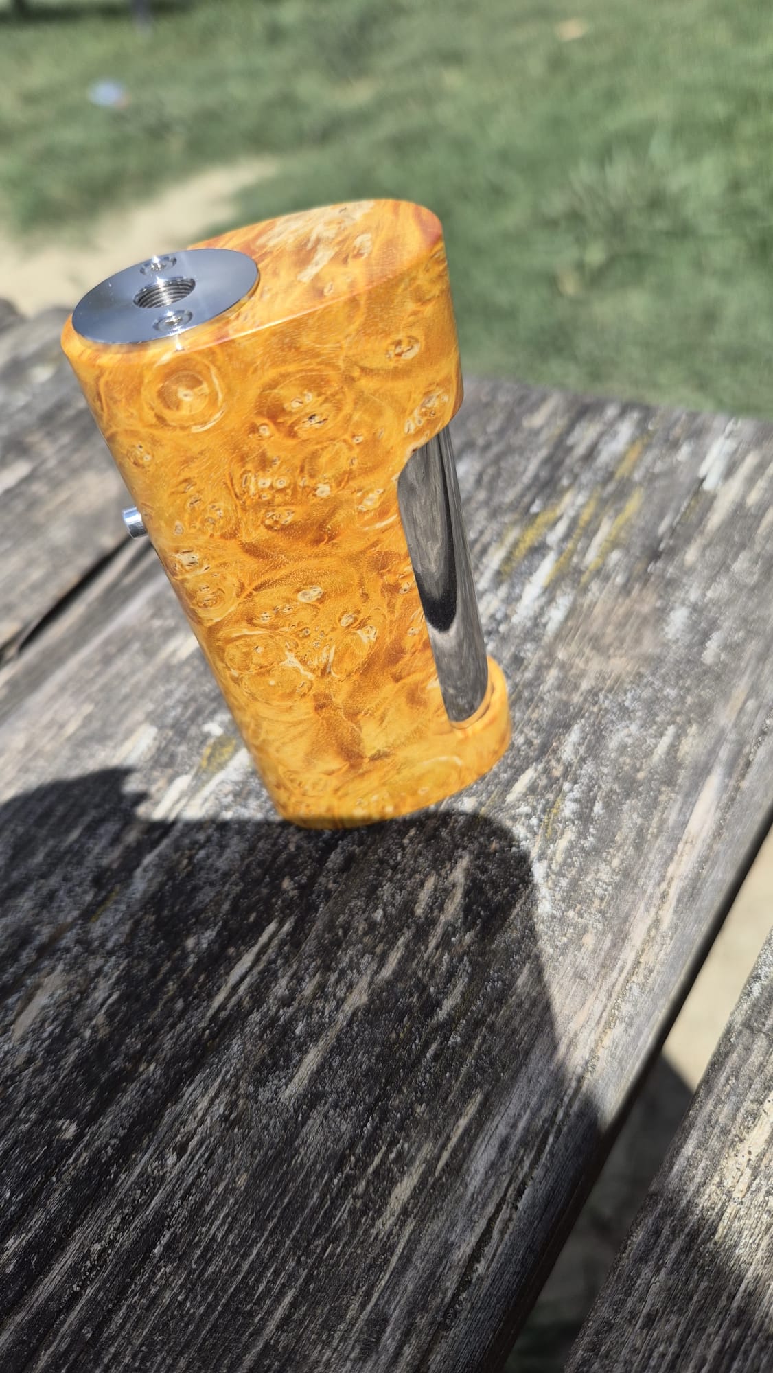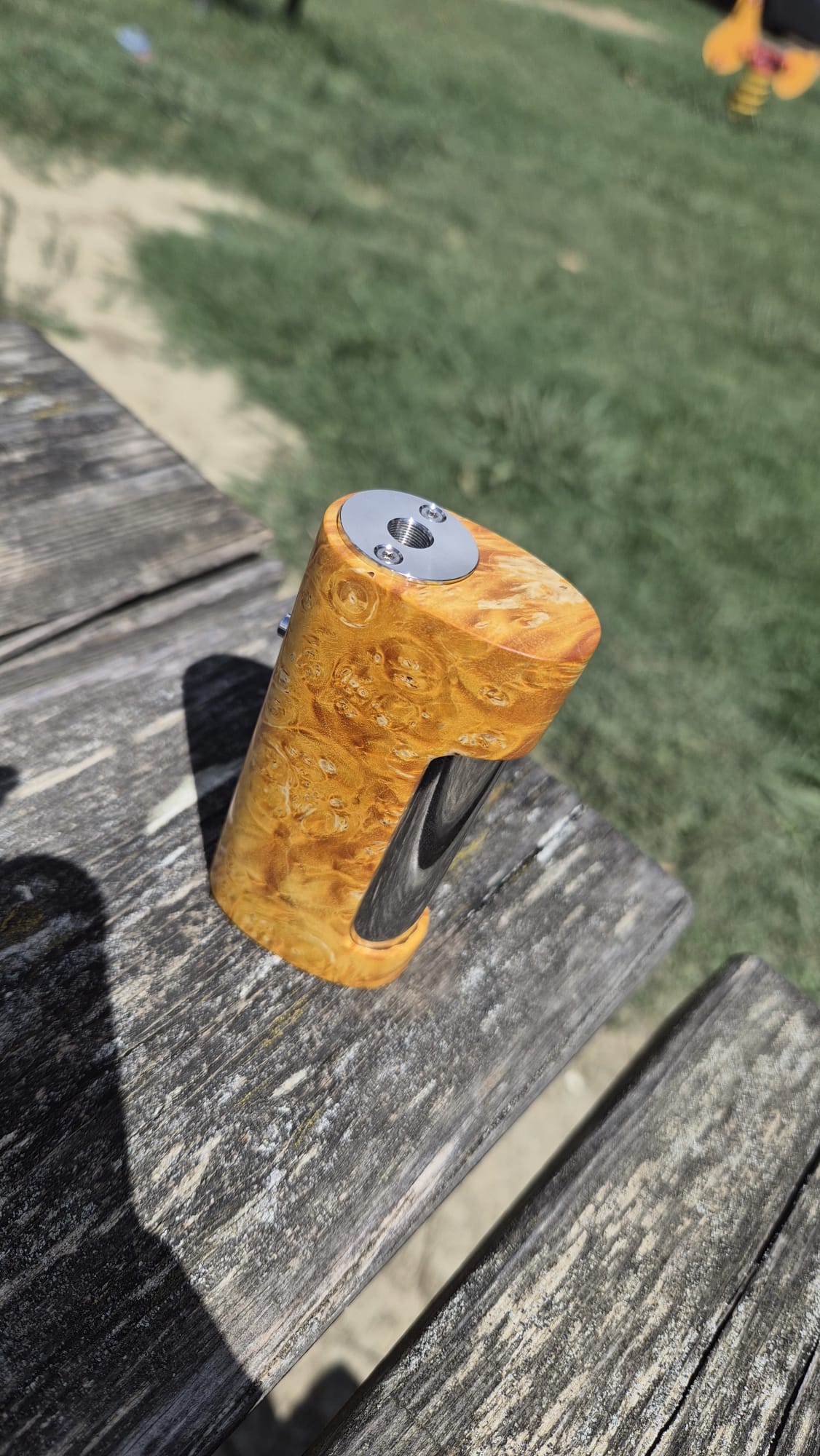 Box Mod con corpo in Legno di Radica di Acero Stabilizzato, lavorato a mano. Ogni pezzo ha venature e tonalità uniche. Elettronica; Nucleo Compact 60W.